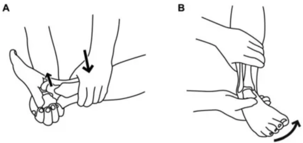 - 검사 손: 다른 손으로 종골(calcaneus)과 거골 복합체를 감싸 잡음