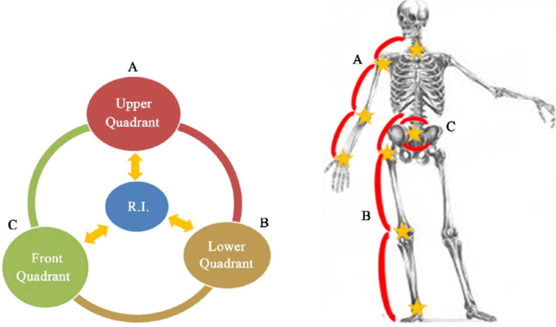 중요한 개념은 "regional interdependence(영역 간 상호의존성)"입니다. Wainner 등(2007)이 제안한 이 개념에 따르면, 신체의 한 부위 기능 장애는 인접한 또는 먼 부위에 영향을 미칩니다. 무릎 통증의 경우, 발목-무릎-고관절이 하나의 운동 사슬을 형성하며, 한 부위의 문제가 다른 부위에 과도한 부하를 전가합니다.