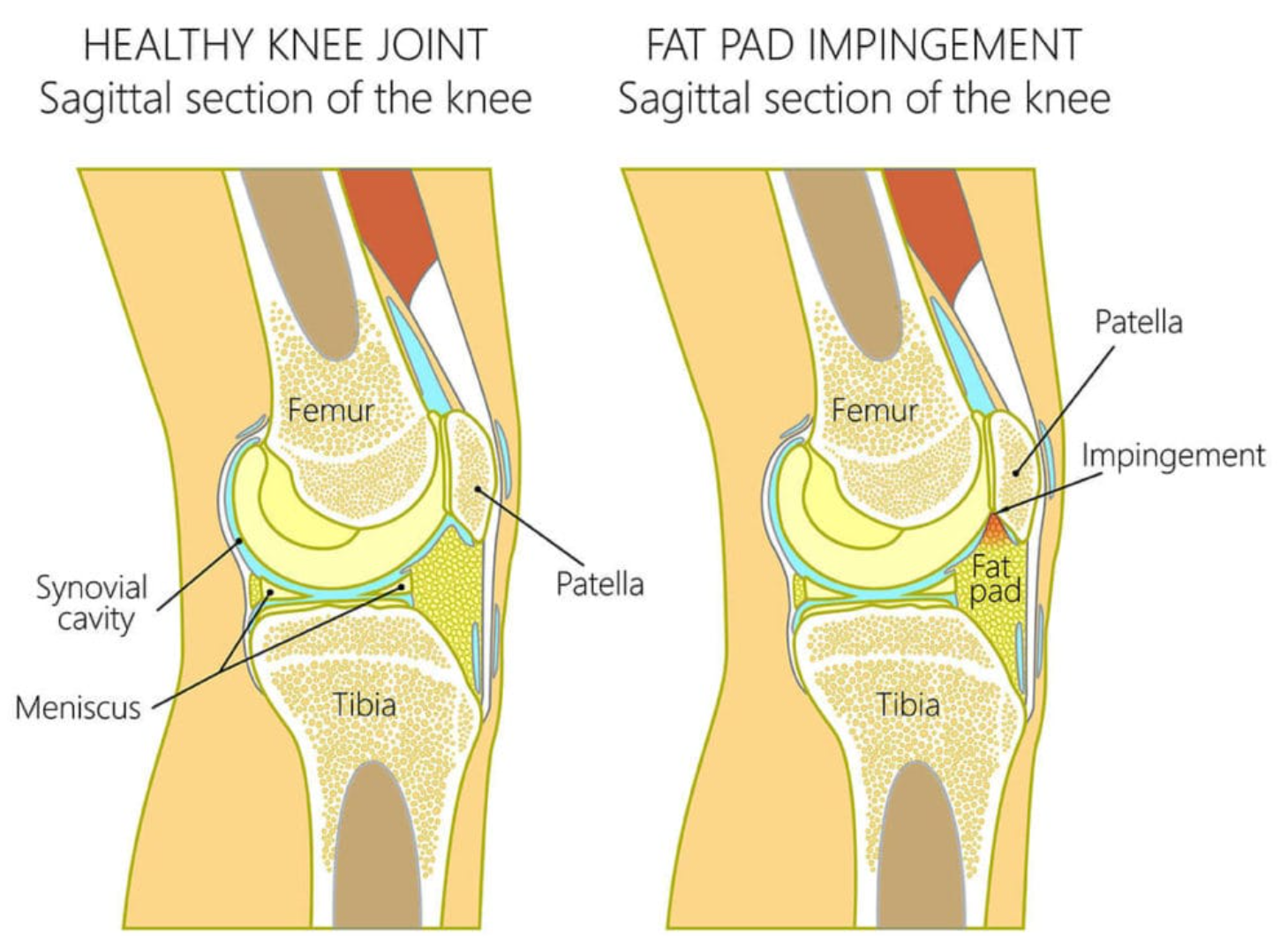 Hoffa 지방패드는 단순한 충격 흡수 구조가 아닙니다. Clockaerts 등(2010)의 조직학 연구에서 이 지방패드에는 통증 수용기(nociceptor)와 기계적 수용기(mechanoreceptor)가 매우 밀집되어 있어, 작은 압박에도 강한 통증 신호를 발생시킬 수 있습니다.