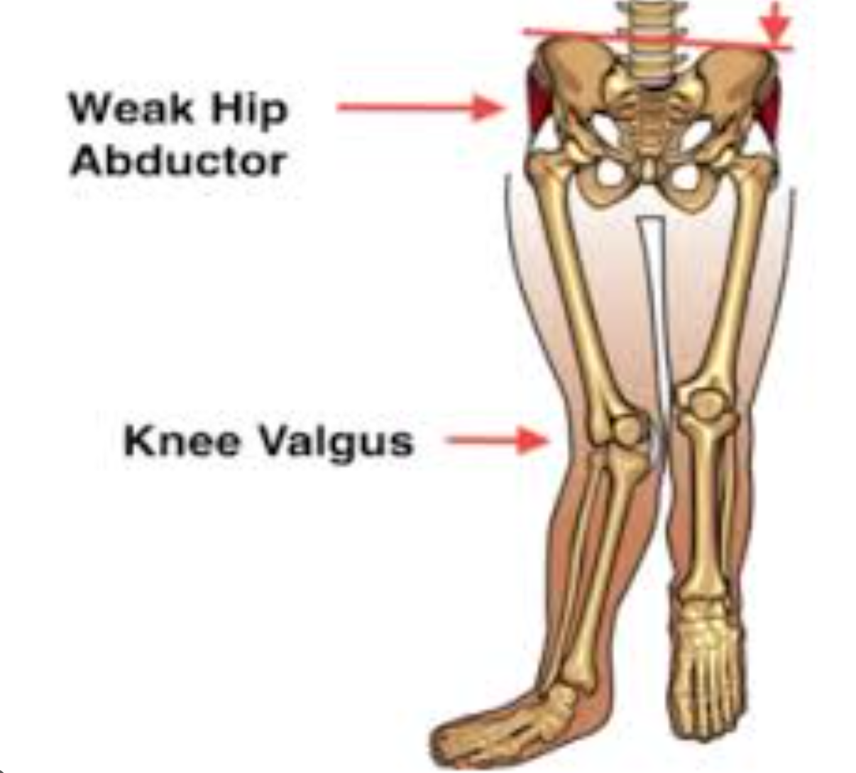 고관절 외전근과 외회전근(중둔근, 소둔근, 심부 외회전근)이 약하면 다음과 같은 연쇄 반응이 발생합니다. Souza와 Powers(2009)의 3D 동작 분석 연구에서 이 메커니즘이 명확히 규명되었습니다.