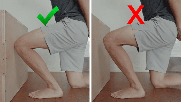 - 무릎을 앞으로 밀어 벽에 닿도록 시도 (발뒤꿈치 바닥 고정)