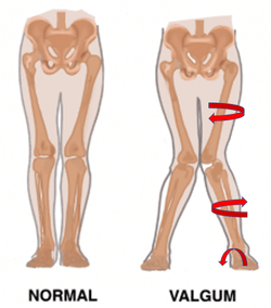중둔근 약화 → 골반 반대측 하강 (Trendelenburg sign) → 대퇴골 내전+내회전 → 무릎 내반 → 슬개골 외측 편위 → 외측 슬개대퇴 관절 압력 증가